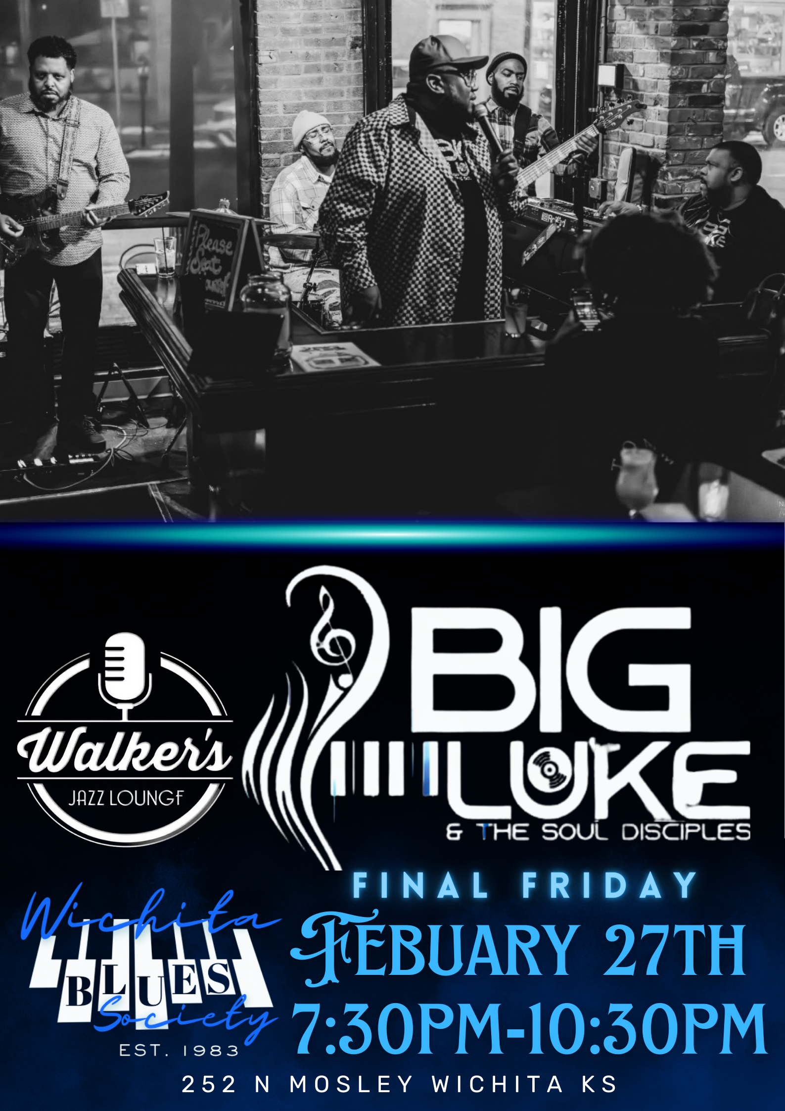 Fri27Feb20267:30 pmWalker’s Jazz Lounge 252 N Mosley StWichita Blues Society & Walker’s Jazz Lounge present BIG LUKE & THE SOUL DISCIPLESClear your calendar and brace yourself for a high-voltage night of Blues and Soul.Big Luke & The Soul Disciples bring a spirit-filled, genre-blending show that hits hard and grooves deep.This powerhouse band slides effortlessly from down-home blues to smooth jazz, Motown, R&B, funk, and even a touch of country, all filtered through their own blues-soaked soun