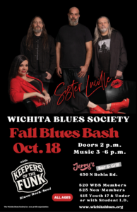 Say HELLO to Fall ! Join friends and fellow blues lovers for our 2025 Fall Blues Bash at Jerry's Bar & Grill on SATURDAY Oct. 18. Doors open at 2, music from 3 - 6p.m. from Sister Lucille and Keepers of the Funk. This is an ALL AGES SHOW! $20 for WBS Members, $25 Non-members. $15 for youth and students.